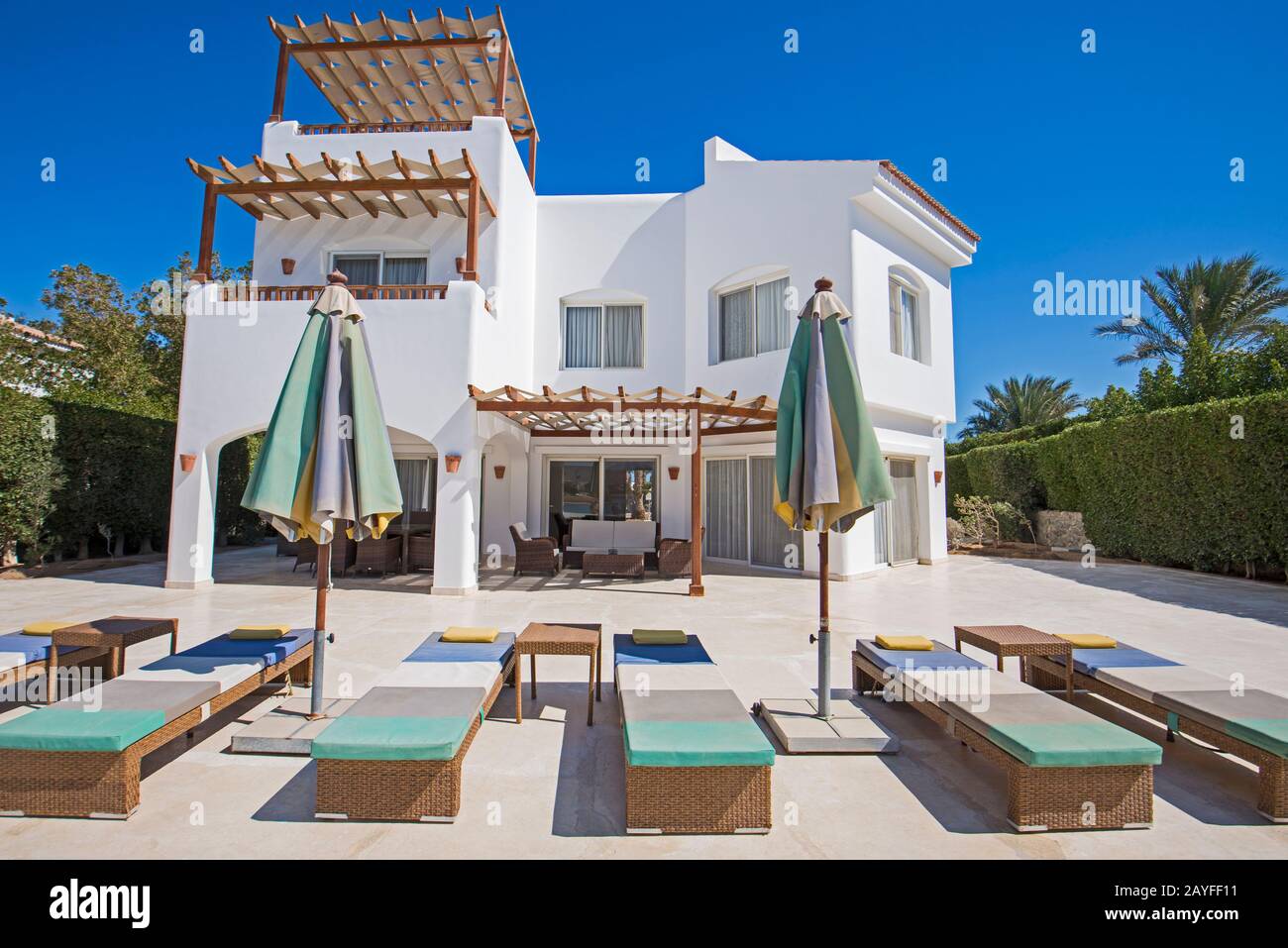 Swimming Pool Of Luxury Holiday Villa Amazing Nature Relax Near Swimming Pool With Handrail Deck Chairs Sun Loungers And Parasols And Umbrella Stock Photo Alamy from c8.alamy.com